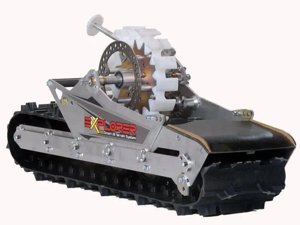 L’Explorer è essenzialmente un kit di montaggio su cingolo che sostituisce la ruota posteriore e un kit di conversione sci che prende il posto della ruota anteriore. La versatilità è il suo punto di forza: AD Boivin assicura la compatibilità con quasi tutte le marche di moto.