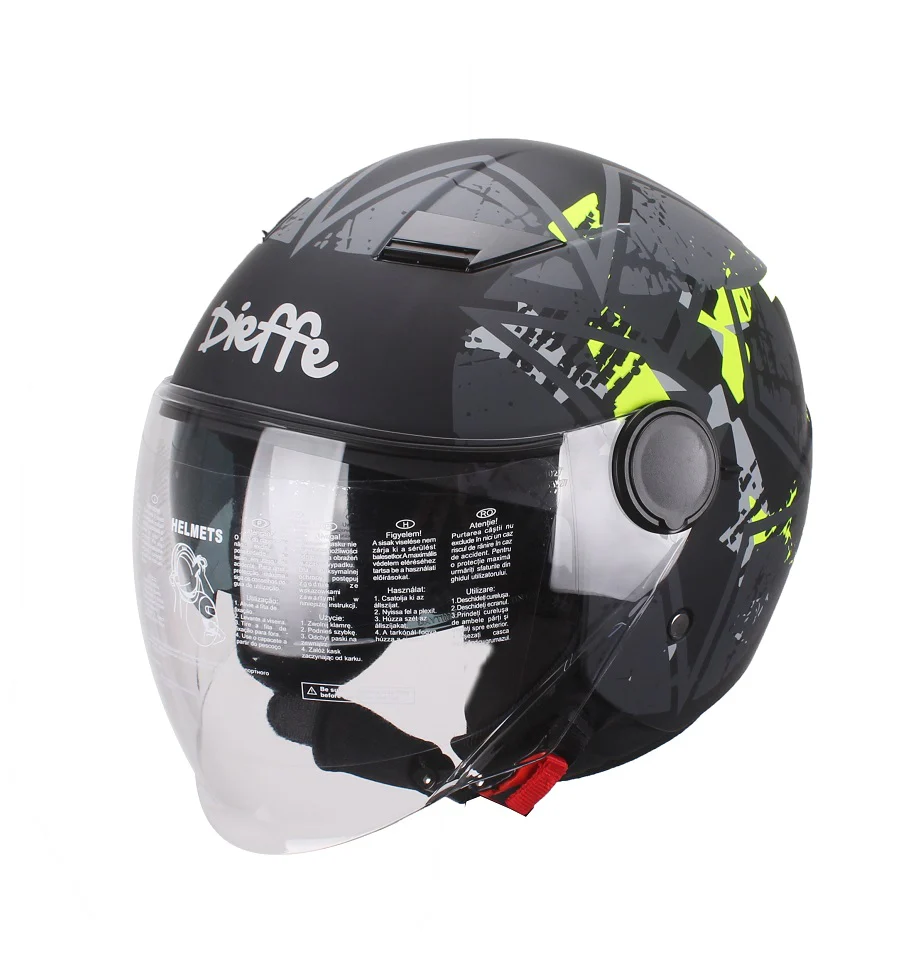 Nonostante il prezzo competitivo, il Dieffe DF88 non rinuncia alla qualità dei dettagli. La visiera trasparente a elicotterista o sagomata (a seconda della versione) è trattata con una protezione antigraffio per assicurare una visibilità ottimale nel tempo. Gli interni sono realizzati in tessuto anallergico, studiato per offrire un contatto morbido con la pelle e una buona traspirabilità.